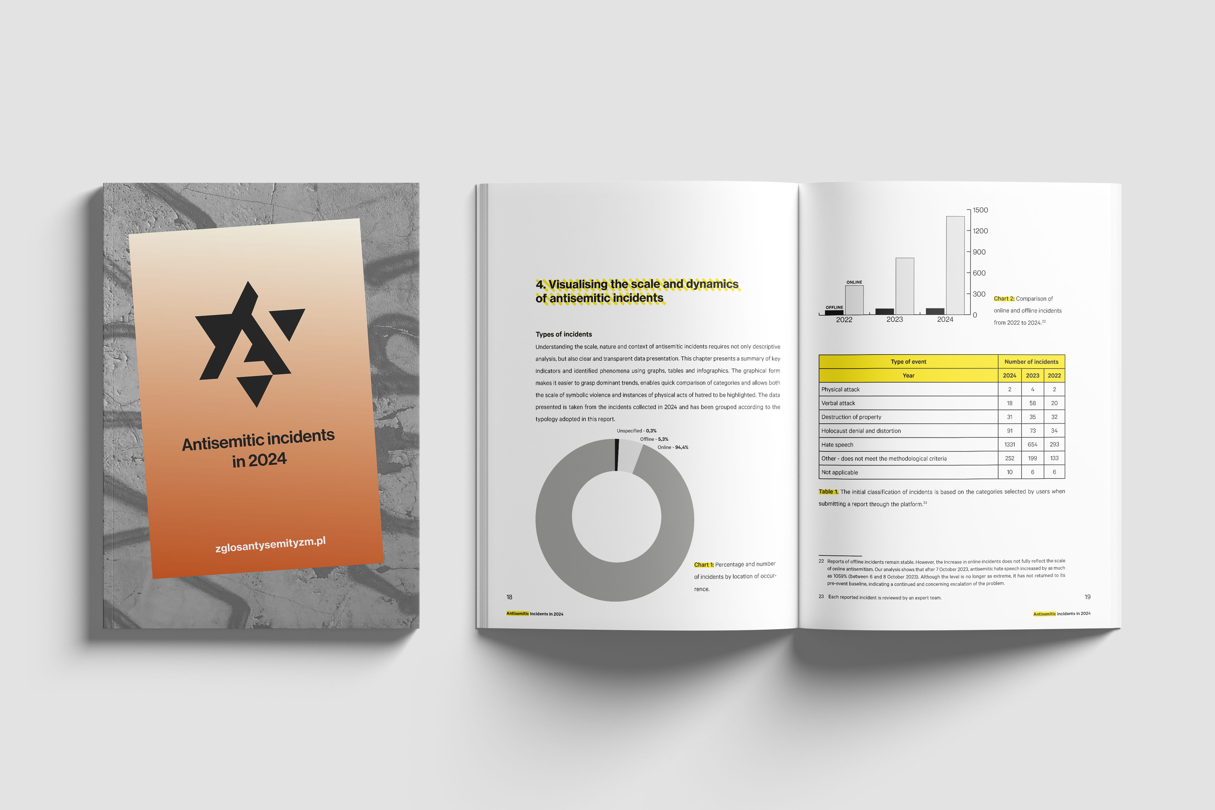 The analysis identifies key trends and the risks faced by the Jewish community in Poland. Alongside statistics, it includes thematic chapters on rising online patterns such as sexist attacks on women identified as Jewish, Holocaust denial and distortion, correlations with national and international events, and developments linked to the presidential elections.